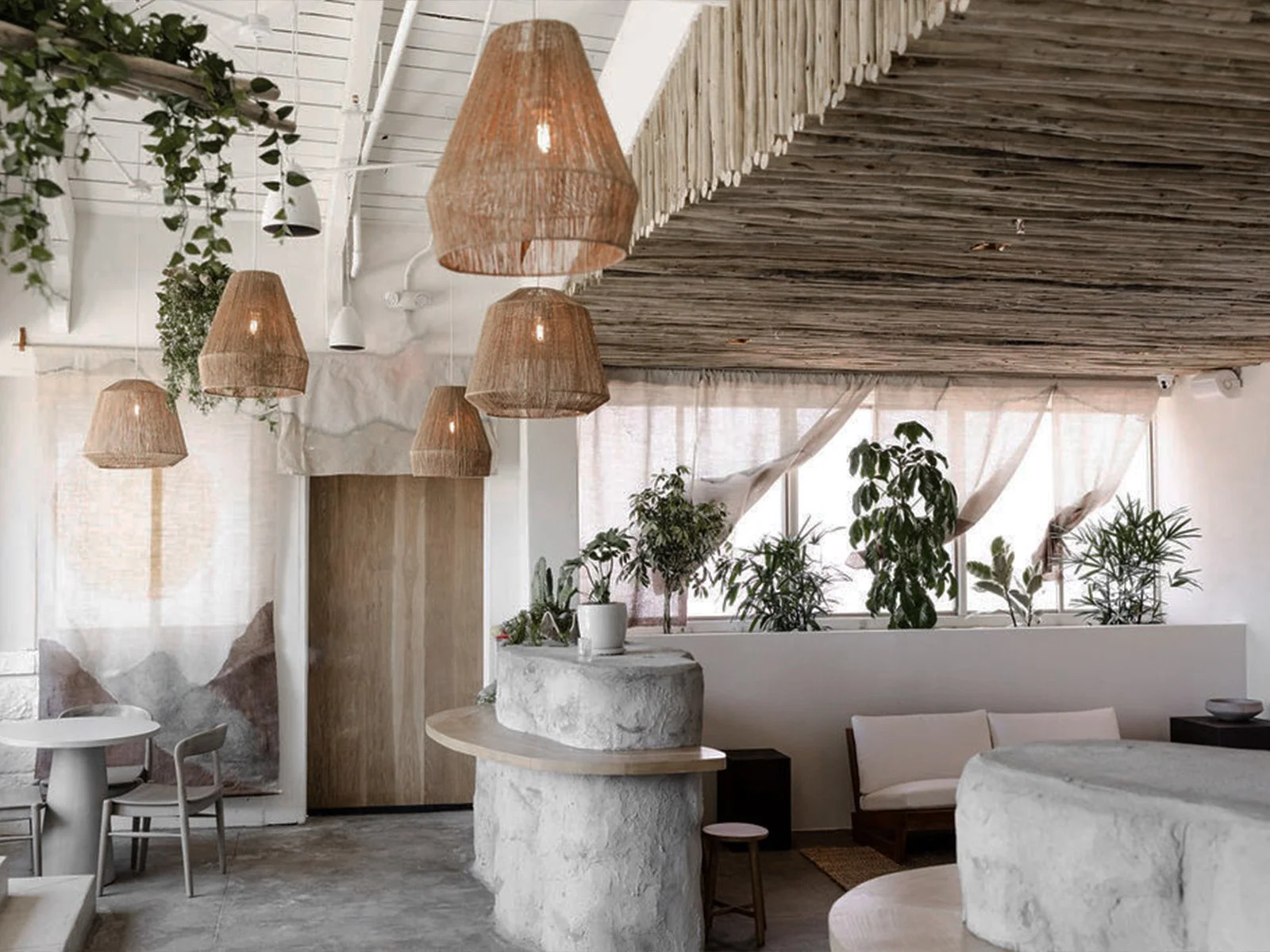 Eucalyptus poles weave through the ceilings and walls, adding an earthy touch, while terracotta-colored plaster envelops the bar, enhancing its warmth and intimacy. A bright sunroom, with soft white plaster walls, contrasts this richness, creating an airy, relaxed ambiance. Plastered stone walls define seating areas, lending texture and privacy while maintaining an open, inviting flow.
